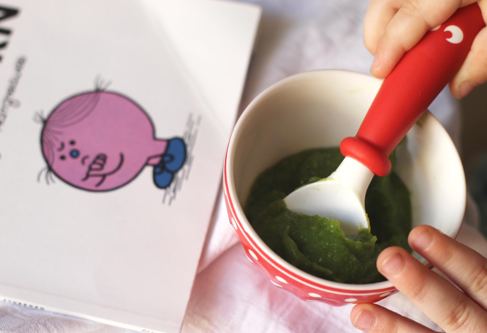 De flesta vuxna veta att gröna grönsaker är bra för en. De flesta små barn gör vad för något som helst för att undvika grönt. Vera har kommit in i en period där det minsta gröna blad ska petas bort. Jag har funderat kring detta och känner ett ansvar för att göra min dotter bättre vän med den gröna maten. Det är då efterrätter kommer in i bilden. Vera älskar fortfarande sina efterrättspuréer och här såg jag min chans att smyga in lite gott & grönt. Denna kombo av spenat, torkade aprikoser och banan är helt knallgrön i färgen och jag var en aning nervös när jag presenterade den för henne. Först såg damen lite tveksam ut. Men efter en stunds fundering provsmakade hon och konstaterade att ”den var god!”. Ett noll till grön mat. Purén kan serveras till alla över 12 månader.